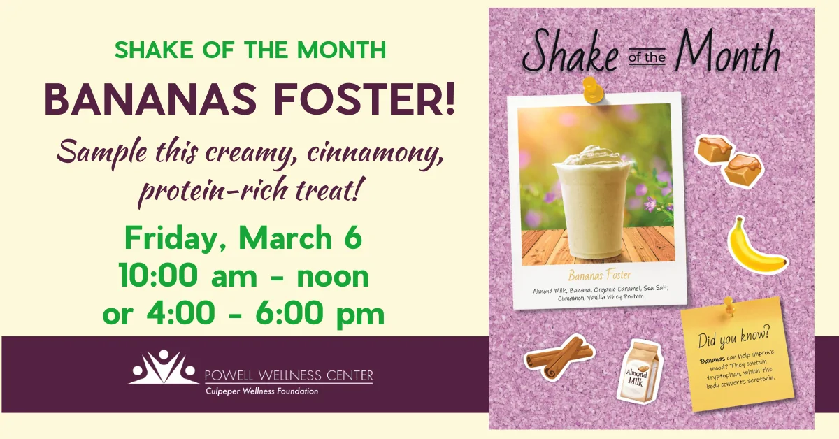 Stop by the cafe on Friday, March 6 to sample the smoothie of the month, Bananas Foster!