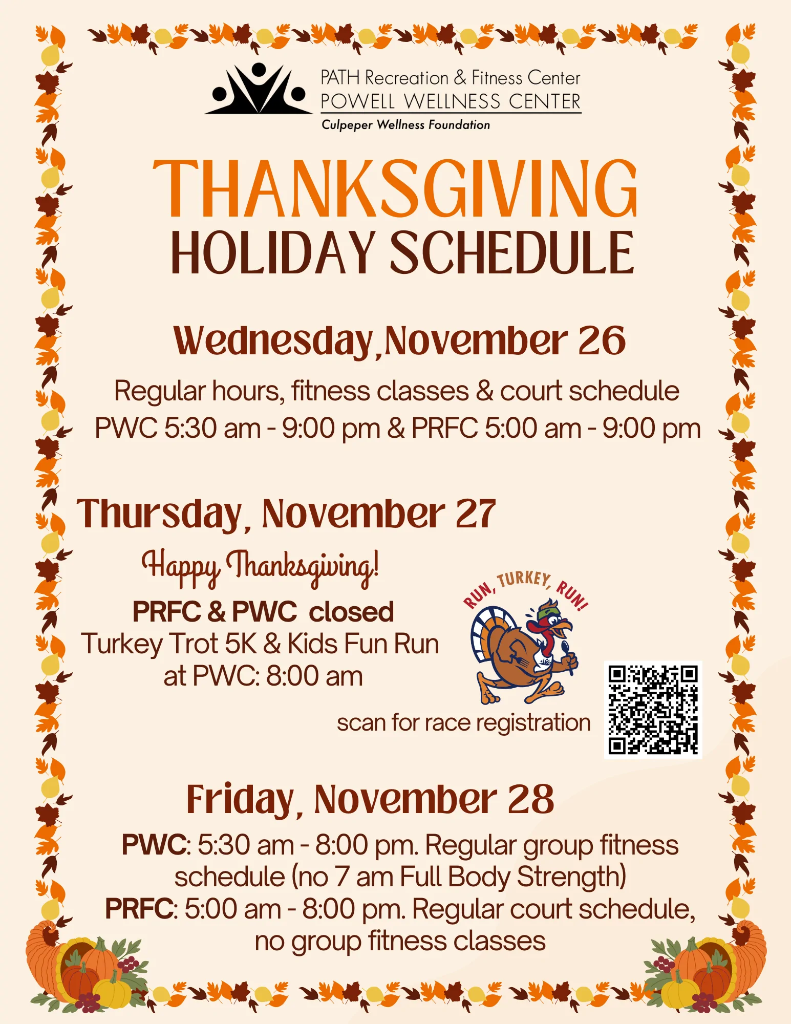 On Thanksgiving Day, Thursday, November 27, our facility will be closed except for the 8:00 am Turkey Trot.
